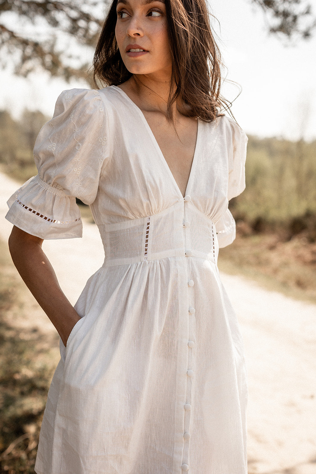 - detailed fagoting on the bodice and sleeve