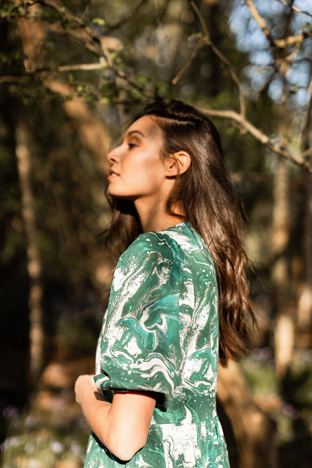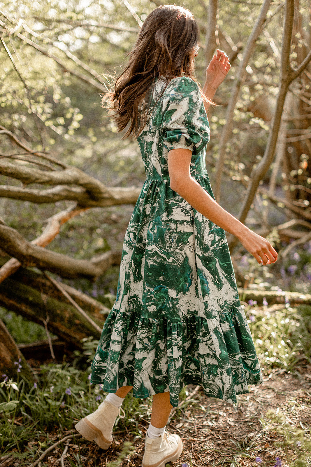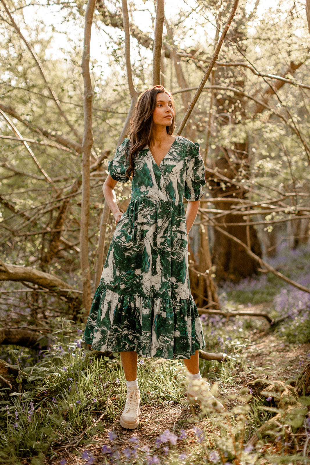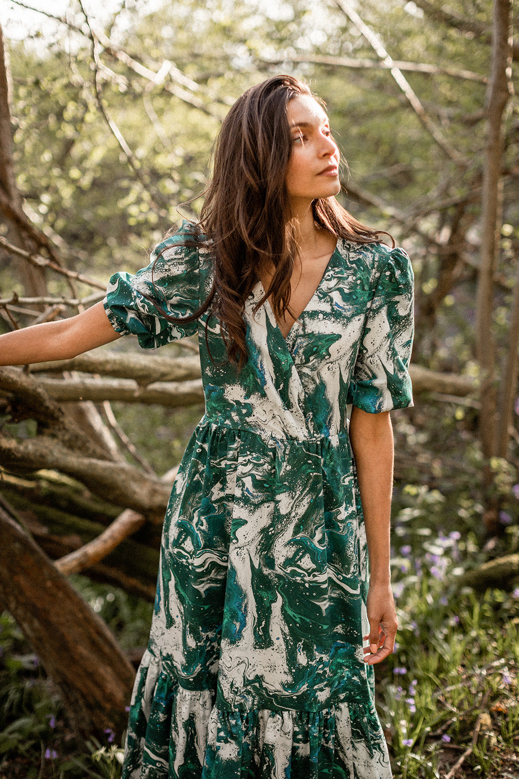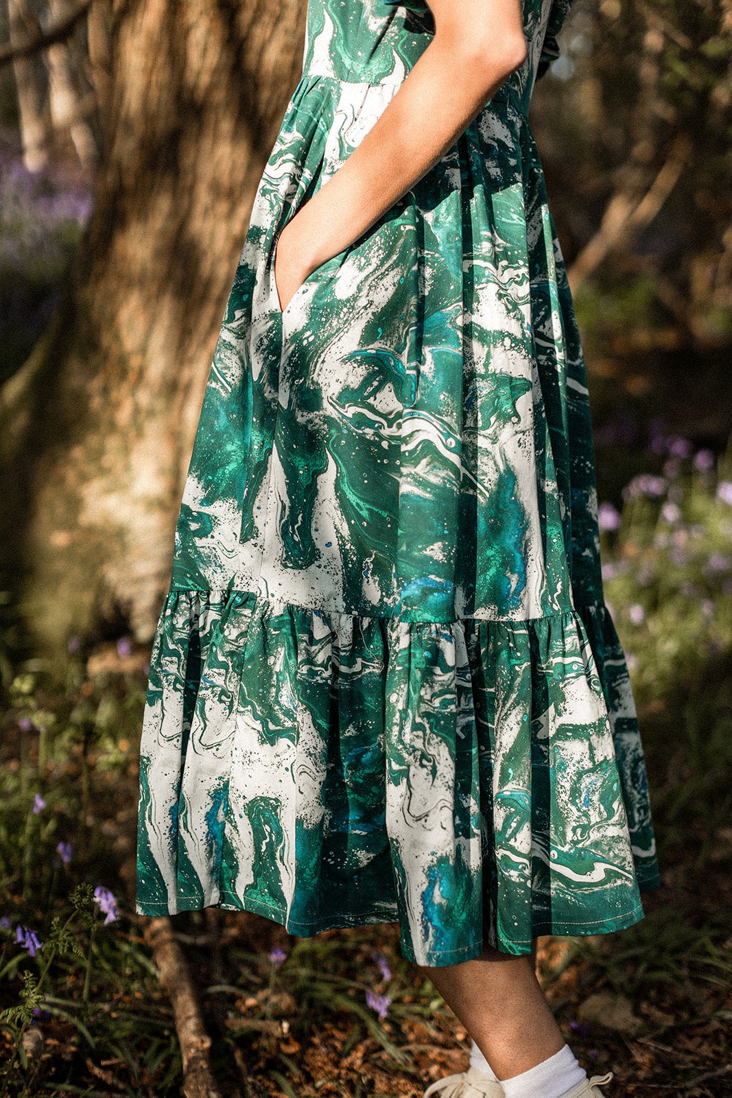 Are you as elegant as a marble statue of a Greek goddess? yes. will this dress help convince you of that fact? also, yes. designed by hand and inspired by the emerald tones of the beautiful northwest Welsh coast, the Caitlin can be thrown on to enthrall whomsoever is beholding you, or put you in the mood for your daily hot girl walk. made to be practial, pretty, and (p)really easy to wear in equal parts, it’s printed in the UK on GOTS organic cotton